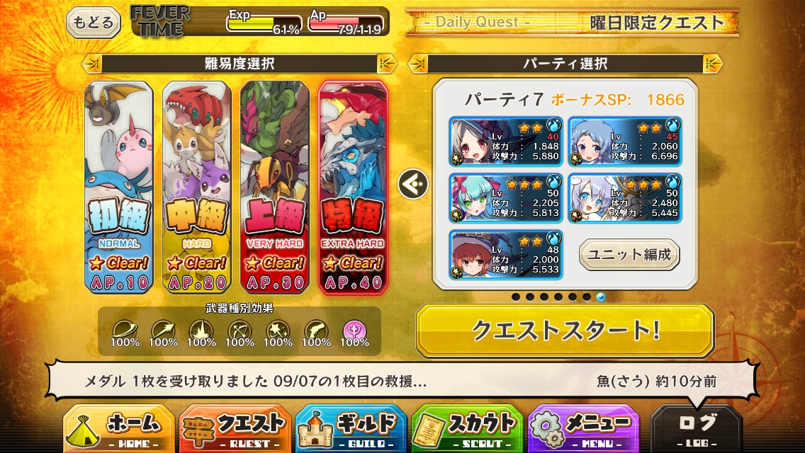 Lv40の遠距離が5体居れば、曜日クエは余裕だと思います